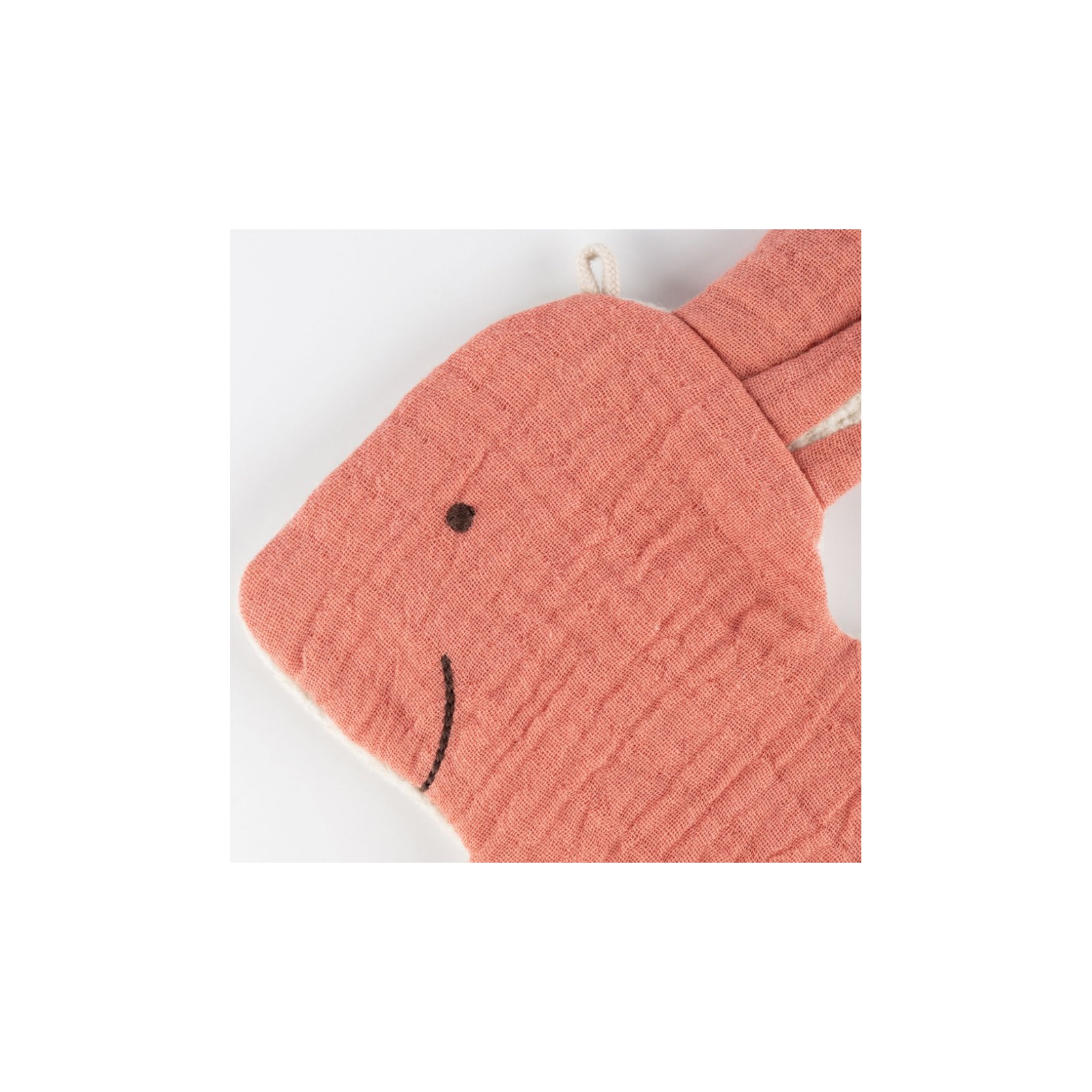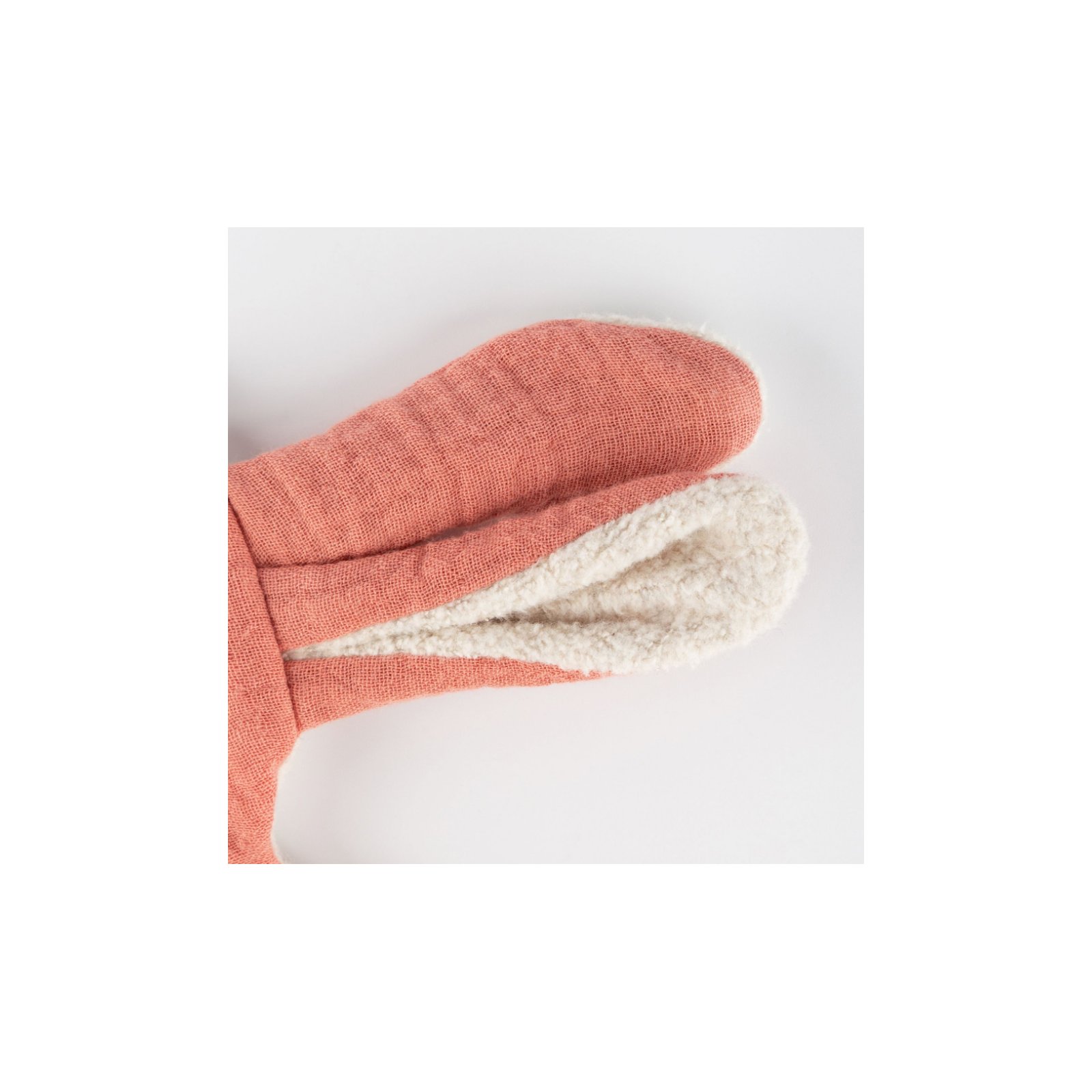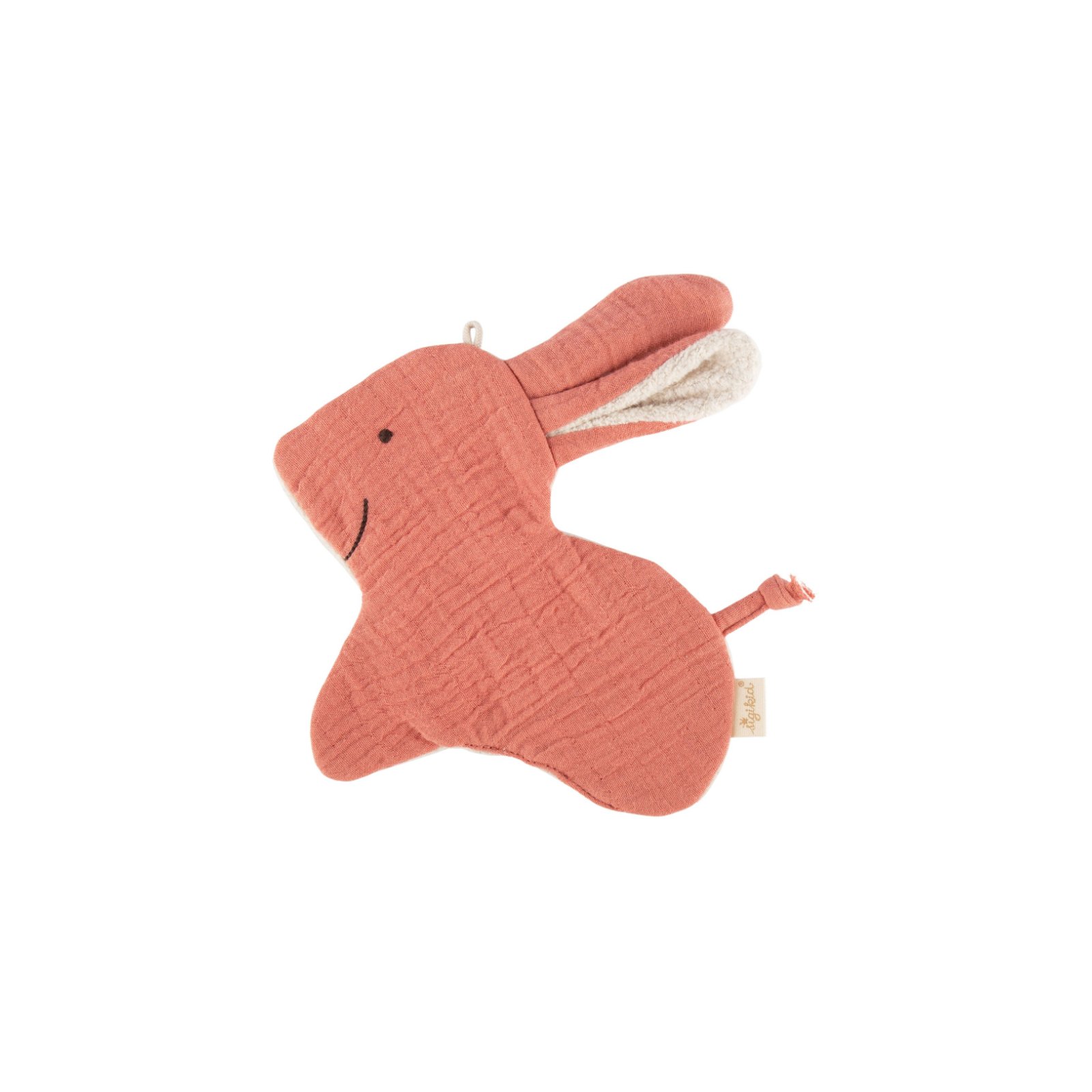 Smidigt babytæppe i kanin-stil med indsat raslende folie, en dejlig gave til en nyfødt baby. Den krøllede forside på dette dejlige tæppe er lavet af delikat muslin, et løst vævet bomuldsstof. Bagsiden er lavet af fløjlsblød bomuldsfleece. Behagelig at putte op ad og hurtigt nem for små fingre at gribe fat i.
