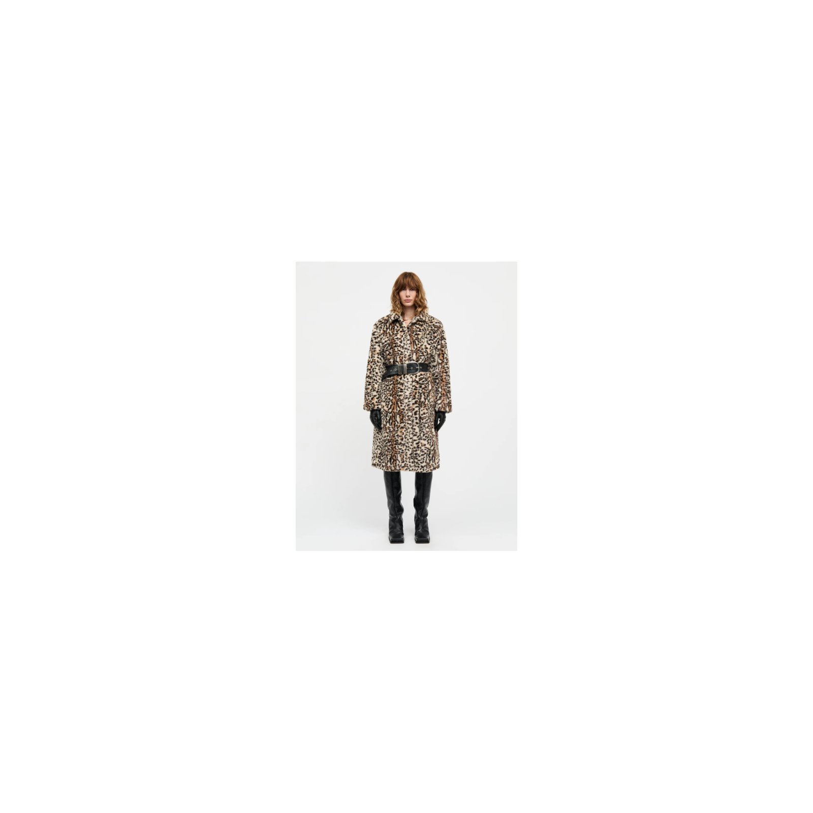 Bælte i reptilpræget læder med metalstropper og buet bæltespænde.