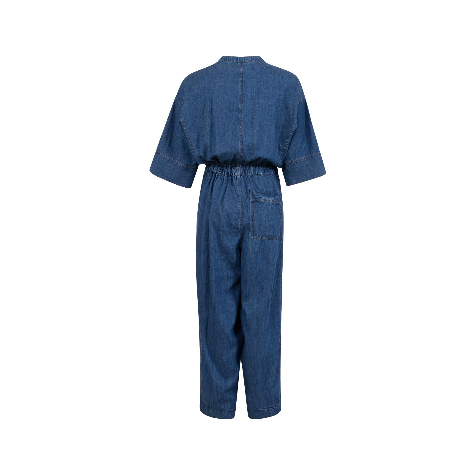 Super cool buksedragt med bindebælte foran, som giver en klædelig pasform og figur. Buksedragten er løs i modellen og rummelig. Lækre detaljer som guld trykknapper og brede manchetter ved de 3/4 lange ærmer. Vingeærmet giver den lidt posede overdel og med plads til barmen. Smart til både en sandal eller til efteråret til en støvle. Tag din normale størrelse.