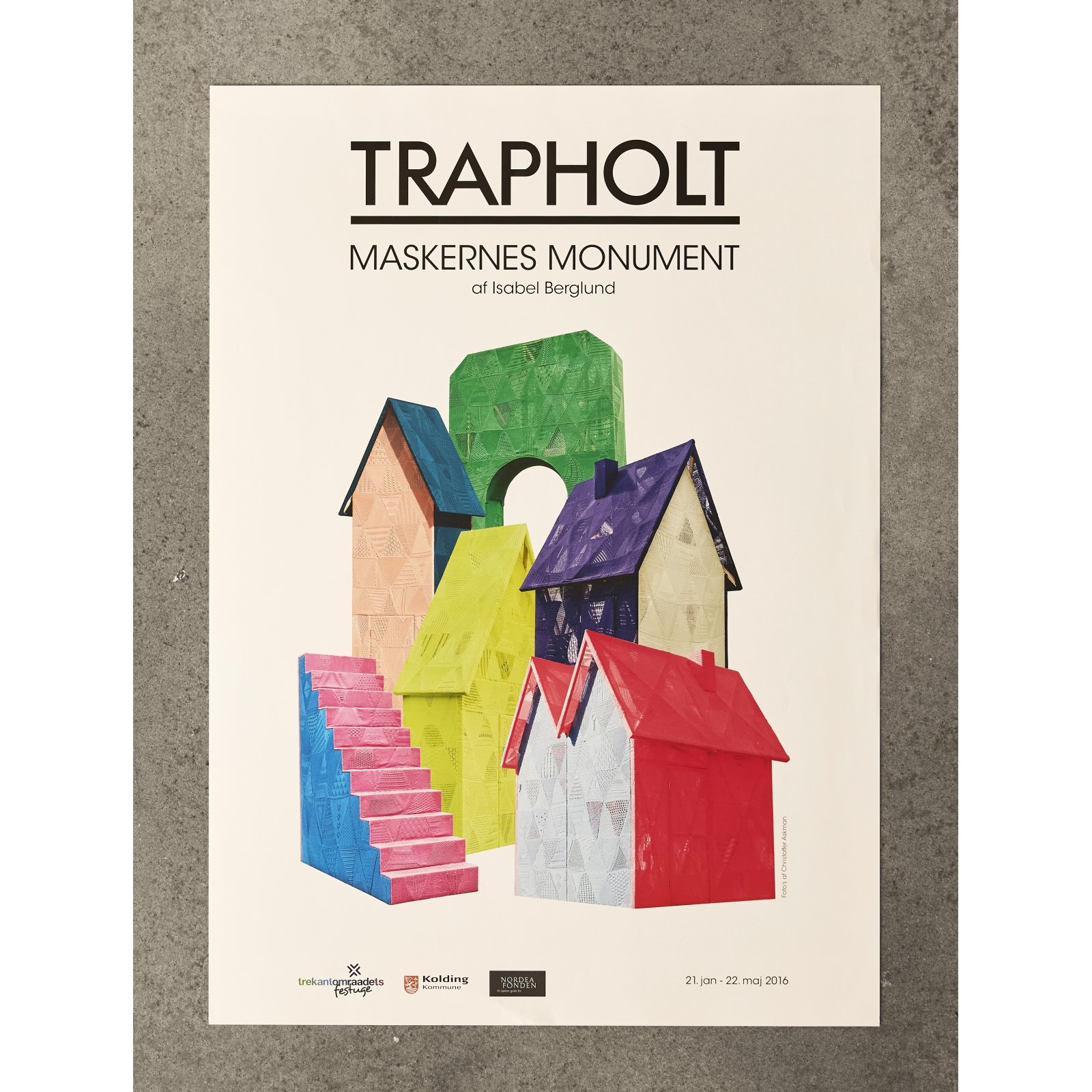 Udstillingsplakat fra udstillingen Maskernes Monument på Trapholt fra 2015. Kunstner Isabel Berglund skabte dette værk i samarbejde med 700 strikkeglade borgere i hele landet.