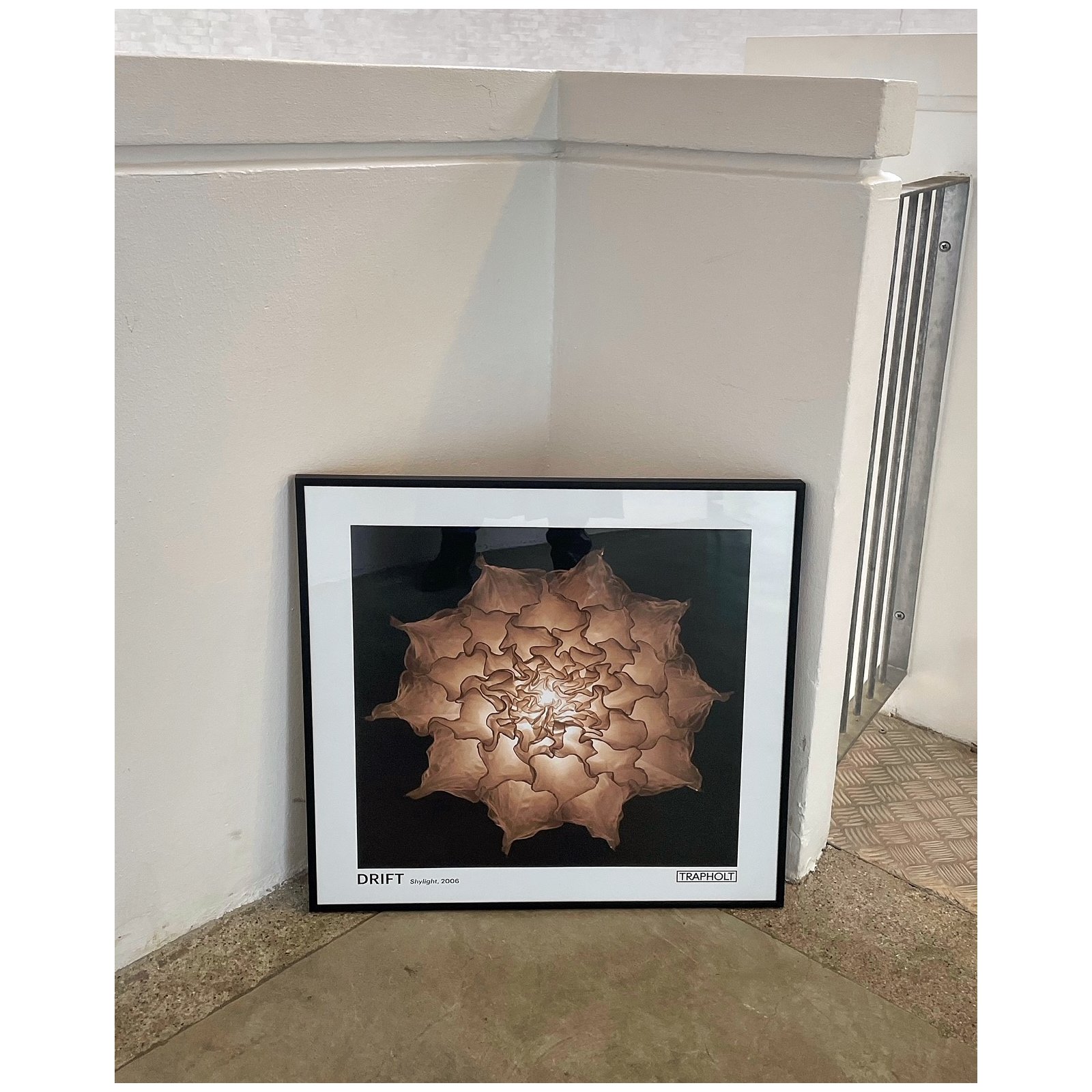 Udstillingsplakat af Studio Drift´s levende installation "Shylight", hvor store hvide blomster dale ned fra loftet i takt med musik.