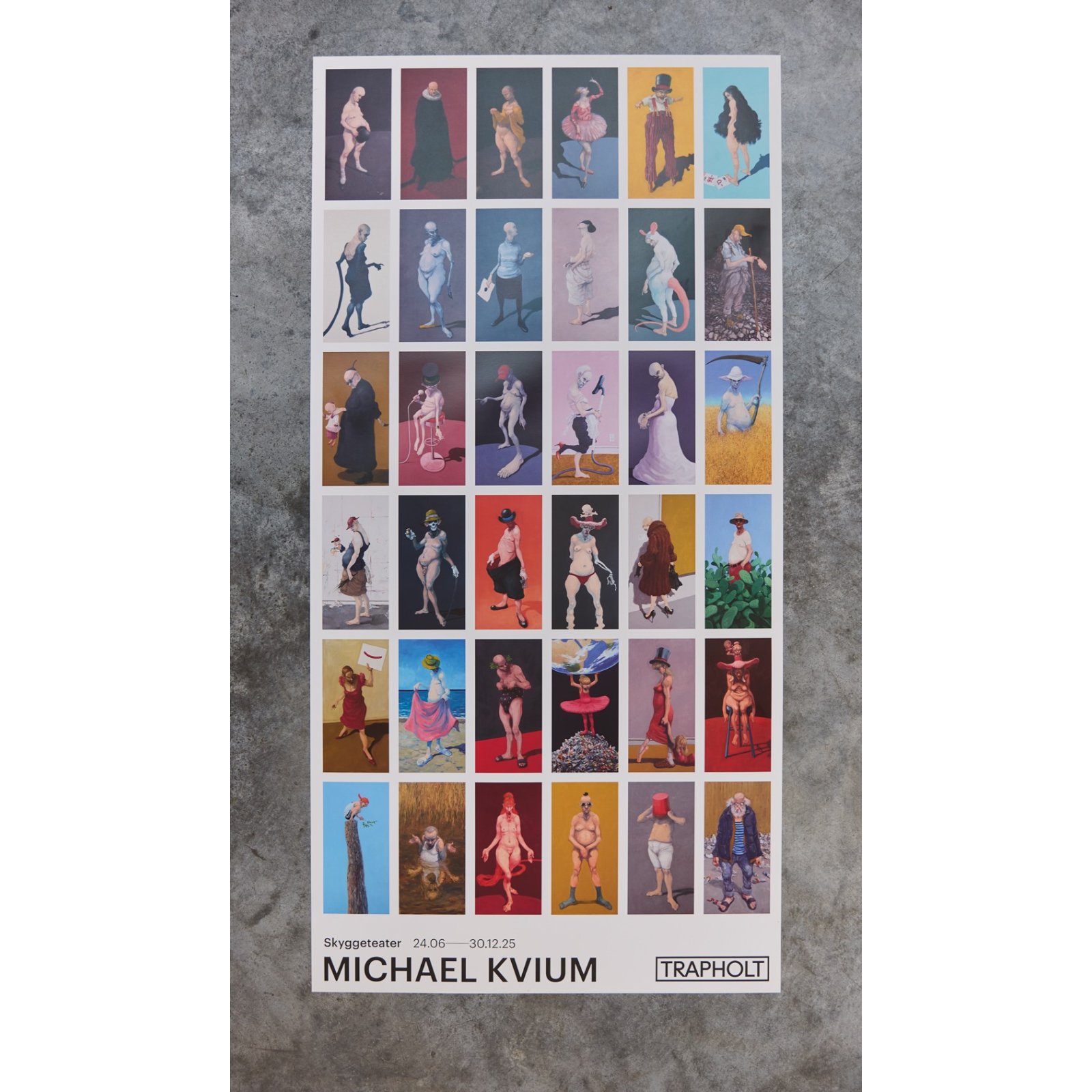 Udstillingsplakat fra Michael Kviums udstilling Skyggeteater på Trapholt i 2025. Plakaten viser alle de 36 kunstværker som indgår i udstillingen. Hver figur i Skyggeteatret fungerer som en aktør i “livets teater” – grotesk, tragikomisk og teatralsk. Kunstværkerne spejler det, vi helst ikke vil se: vores forfængelighed, intolerance, magtbegær og eksistentielle skrøbelighed. Med inspiration fra både teater, satire og det groteske maleri konfronterer Kvium os med det uperfekte og usminkede menneske.