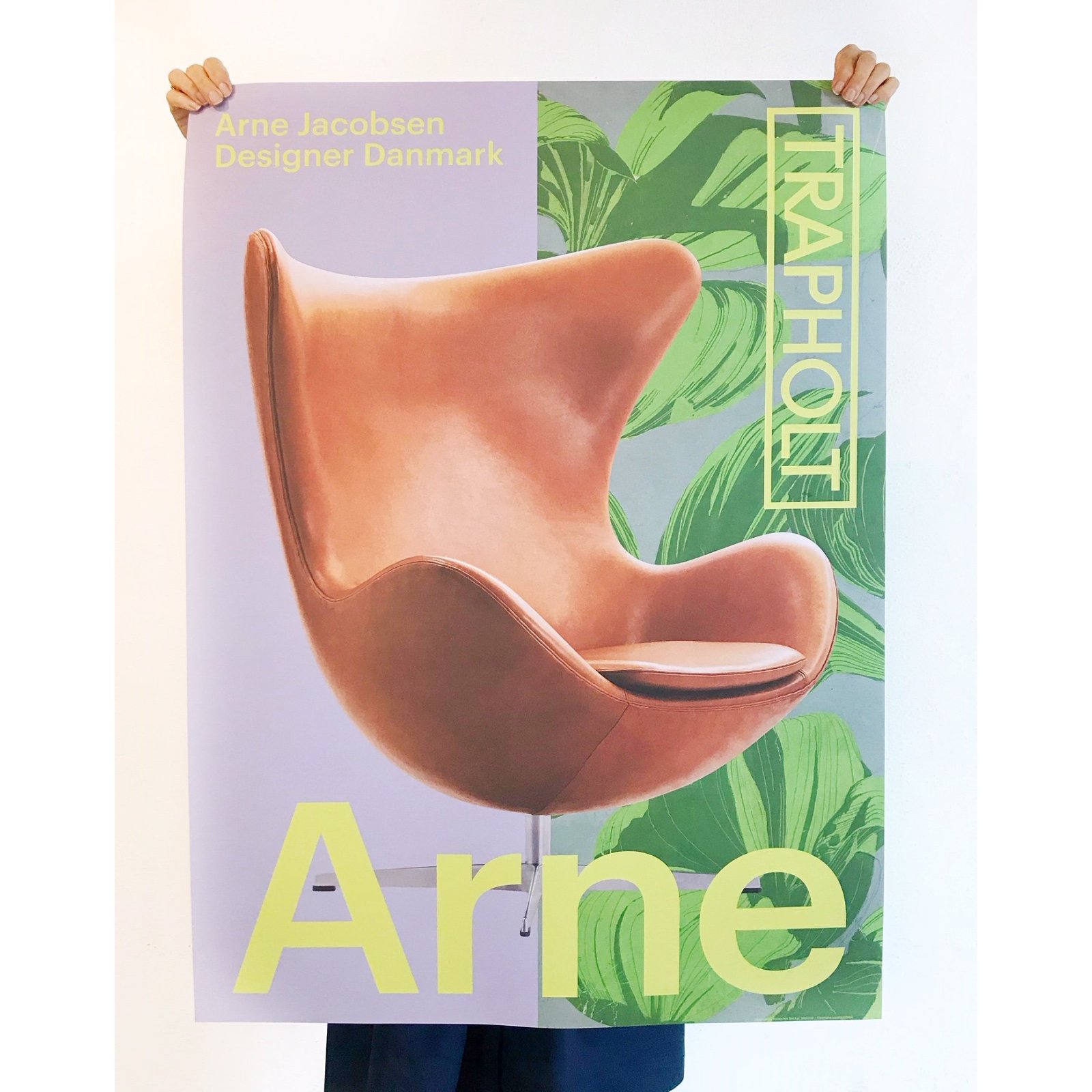 Udstillingsplakat fra Trapholts store udstilling "Arne Jacobsen - Designer Danmark" fra 2020 med den verdensberømt designer Arne Jacobsen.